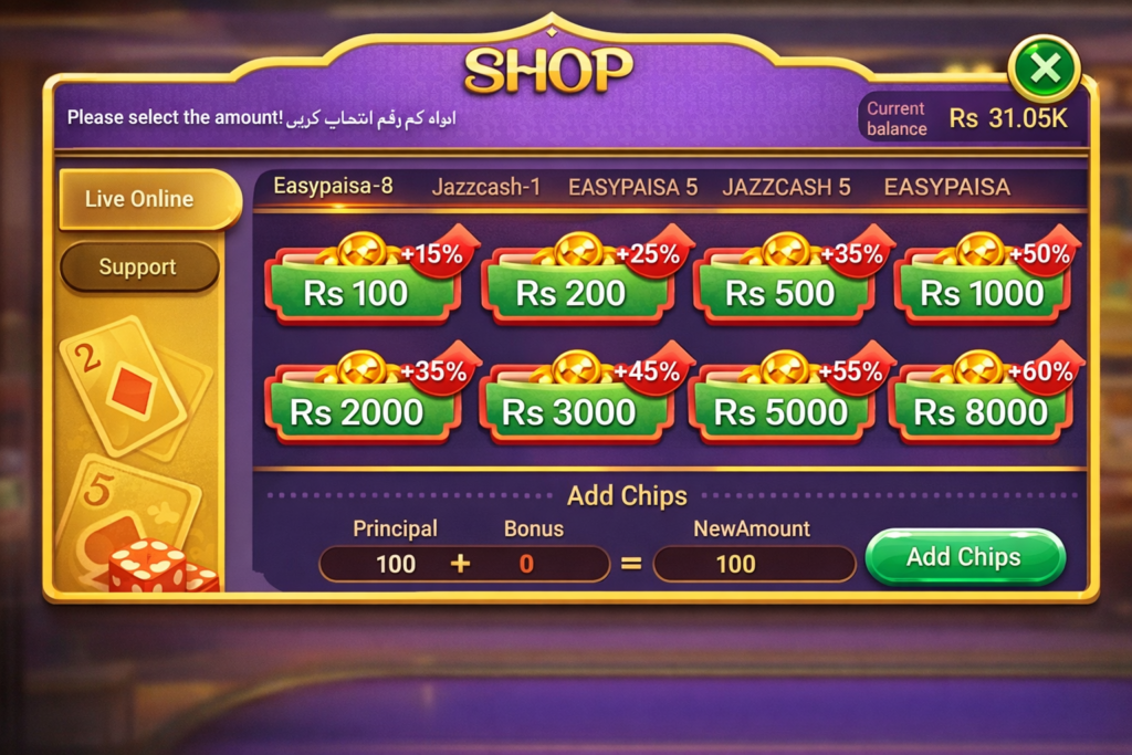 3 Patti Mela supports multiple secure payment options, including JazzCash, EasyPaisa, and Bank Transfer, making deposits and withdrawals simple and convenient for Pakistani users.